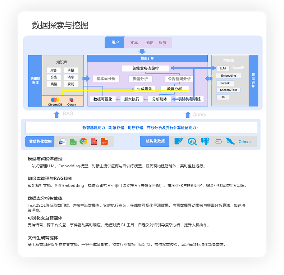 统一存算引擎,实现高并发下跨部门多模态数据的高效整合,构建全方位、多层次数据湖、向量库。